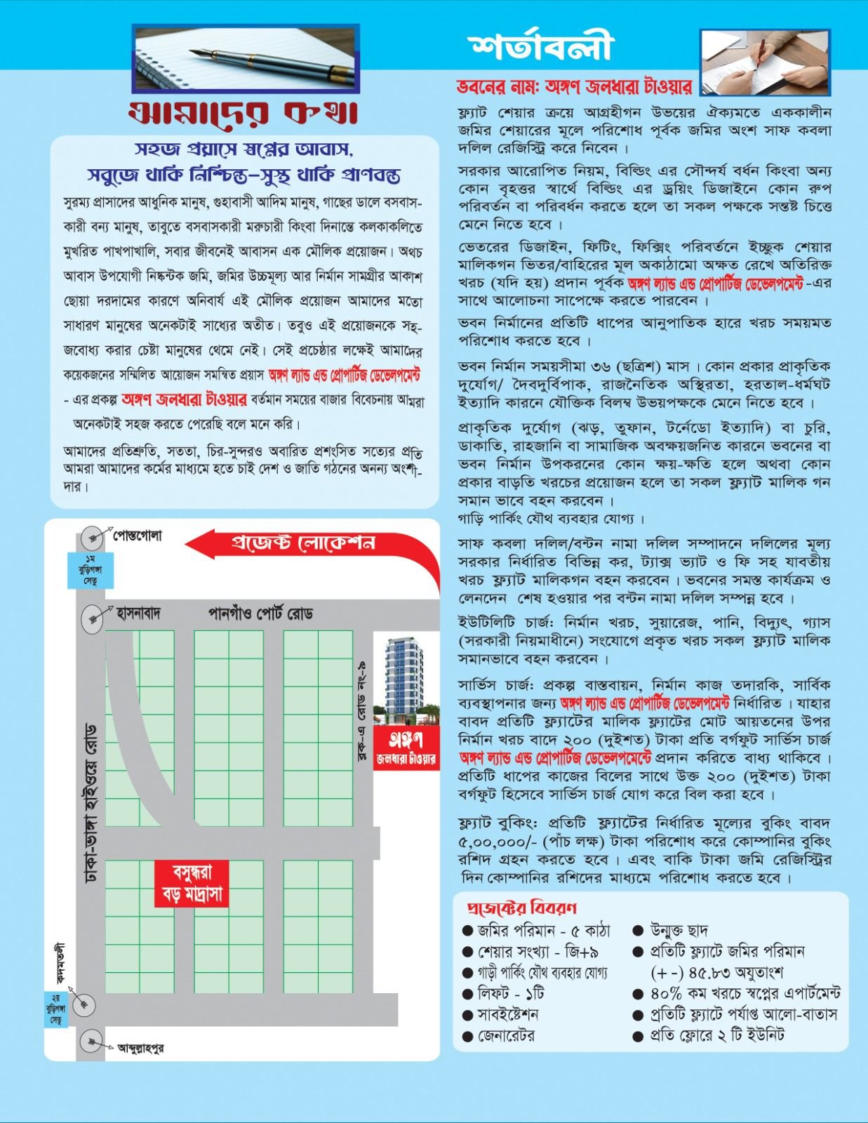 সুরম্য প্রাসাদের আধুনিক মানুষ, গুহাবাসী আদিম মানুষ, গাছের ডালে বসবাসকারী বন্য মানুষ, তাবুতে বসবাসকারী মরুচারী কিংবা দিনান্তে কলকাকলিতে মুখরিত পাখপাখালি—সবার জীবনেই আবাসন এক মৌলিক প্রয়োজন। অথচ আবাসন উপযোগী নিষ্কণ্টক জমির সংকট, জমির উচ্চমূল্য এবং নির্মাণসামগ্রীর আকাশছোঁয়া দামের কারণে এই অনিবার্য মৌলিক প্রয়োজন আজ আমাদের মতো সাধারণ মানুষের অনেকটাই সাধ্যের বাইরে চলে যাচ্ছে। তবুও এই প্রয়োজনকে সহজ ও সবার নাগালে আনার চেষ্টা মানুষের থেমে নেই। সেই প্রচেষ্টার লক্ষ্যেই আমাদের কয়েকজনের সম্মিলিত আয়োজন ও সমন্বিত প্রয়াসে অঙ্গণ ল্যান্ড অ্যান্ড প্রোপার্টিজ ডেভেলপমেন্ট-এর প্রকল্প অঙ্গণ জলধারা টাওয়ার বর্তমান সময়ের বাজার পরিস্থিতি বিবেচনায় আবাসনের স্বপ্নকে অনেকটাই সহজ ও বাস্তবসম্মত করতে পেরেছে বলে আমরা বিশ্বাস করি। আমাদের প্রতিশ্রুতি সততা, চিরসুন্দর ও সর্বজনস্বীকৃত সত্যের প্রতি অঙ্গীকারবদ্ধ। আমরা আমাদের কর্মের মাধ্যমে দেশ ও জাতি গঠনে একটি অনন্য অংশীদার হতে চাই।
